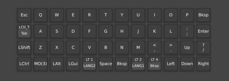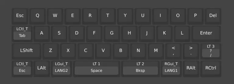 上のレイアウトはALETH42の初期キーマップになります。最下段の中央にはミニバーが2個並んでいて、左側はスペース、右側はバックスペースが割り付けられています。そして、スペースの上にはLT1、バックスペースの上にはLT2と書かれているのが確認できます。