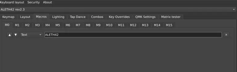 では、数字の「1」を入力したいときはどうすべきでしょうか? 答えは右側ミニバーを押しながら「Q」です。右側ミニバーを押しながら「W」を押すと「1」、「E」を押すと「2」、「E」を押すと「3」といった具合に、ALETH42の最上段はレイヤーの1番2番を有効にすることで数字行として機能するというわけです。 ちなみにレイヤー3にはファンクションキーが割り付けられているので、下から2行めの右端に位置する「LT3」を押しながら「Q」を押すと「F1」、「W」を押すと「F2」……「P」を押すと「F10」が入力されます。 ALETH42 rev2にはこうしたレイヤーが10枚(!)あるため、通常のキーボードを軽く超えるキーコード数をハンドルすることが出来ます。単純なキー入力だけでなく、マクロとして登録したキーをまとめて入力することも可能です。下のスクリーンショットはVialのweb(https://vial.rock)でマクロの0番に「ALETH42」という文字列を登録しているところですが、このようにVialでは簡単にキーマップの変更をオンザフライで行うことが出来ます。