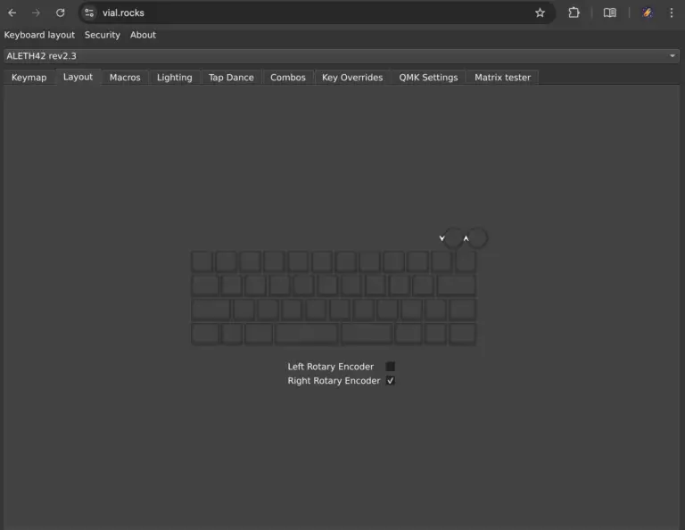 Vialではロータリーエンコーダーの割り付け変更も可能です。ALETH42にエンコーダーを取り付けた場合は、下の図のようにLayoutタブの中で該当するEncoderにチェックマークを入れます。