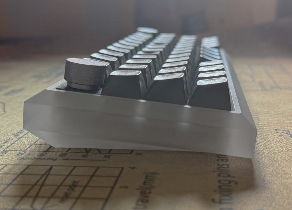 素材についてはアルミ、ポリカーボネート、アクリルの試作を行いました。ポリカとアクリルは似ているようで結構色味が異なり、試作の比較では少し青みがかったポリカに対してアクリルは無色に近く、様々なキーキャップを合わせやすいという判断から今回はアクリルを選択しています。仕上げは美しいサンドブラストになります。