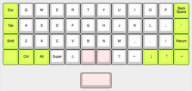 ALETH42 ORTHOのトップレイヤーの例はたとえば以下のようなものがあります。これは初期設定から若干変更し、アロークラスター(矢印キー)を横一列から通常の配置に改変し、エンターを2行目にしています。こうした変更はすべてChrome上のhttps://vial.rocks/から行えます。